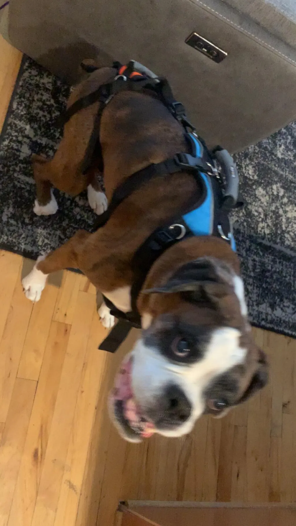 Bodhi has been struggling with symptoms of IVDD for the past year. He's 90lbs and as of late, getting in and out of the car has become impossible. But now, with his new harness, I can easily get him lifted into the car and also down the ramp for the backyard when he needs a little extra support. The only thing we've noticed is that he won't potty with the back harness on. I guess the straps make him self concious? Either way, we're happy with our purchase and so is he! Thank you Help em up Harness!