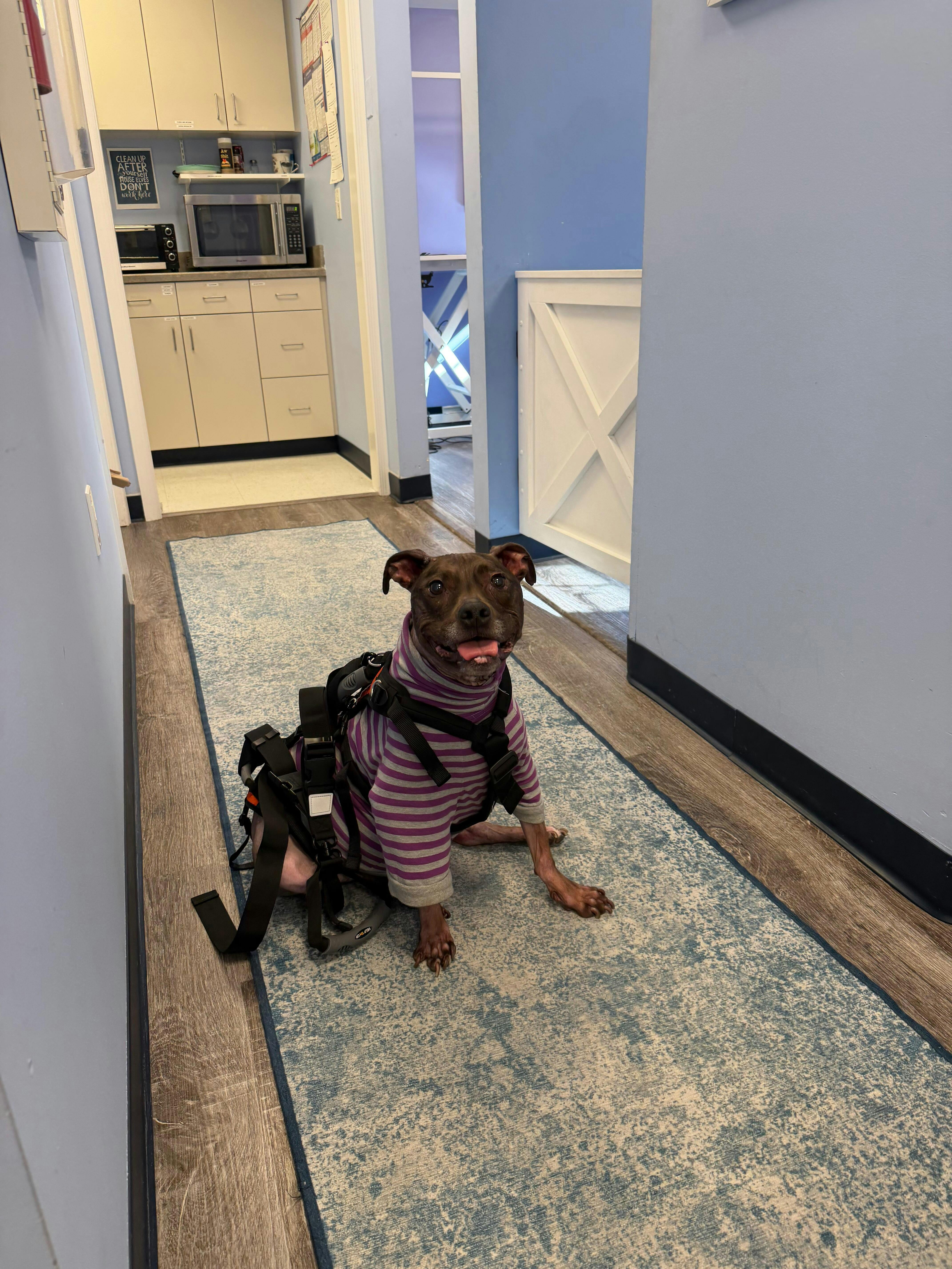 Generally - LOVE the help em up harness system. It’s been a lifesaver for our little pittie’s ACL tear. The walking handle really helps us support her using the bathroom on walks, and walking in general. The only reason I knocked a star off is the rear attachment being a loop is cumbersome and not something we can remove easily, so it makes taking the harness system on and off less simple and easy. Would love two little clips in the back or release there! Still recommend it!